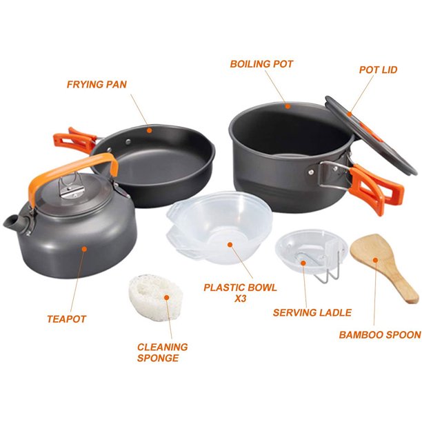 - Save Space & Easy To Carry: When the camping mess kit is well packed, its diameter will be only 7 inches, the height 4 inches, and the weight 0.95 lb. It takes up no space and causes no burden. Camping pots and pans can be easily put into a backpack. Mess kit for camping is designed perfectly for 1-3 people.