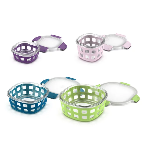 - Mighty Tough: Silicone sleeve protects glass and tabletops and provides a no-slip grip. Color coordinating lid and base make containers easy to spot and match. Clear lid lets you see what’s inside each container.