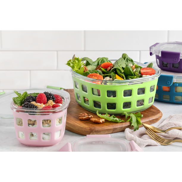 FRESH FOR LONGER. Equip your kitchen with the Ello Duraglass 8pc Mixed Size Round Glass Food Storage Container Set. This set of four glass containers comes with airtight locking lids so you can keep your food fresh for much longer. These containers are leak proof, stain-resistant and oven-safe with the lid off. The containers are protected from chips and breaks by a silicone sleeve. This meal prep set allows you to store food for a feast efficiently and easily.