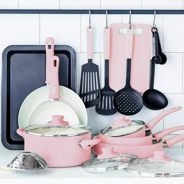 - This cookware set includes: 7″ and 9.5″ open fry pans, 1-quart and 2-quart covered sauce pans, 4-quart covered Casserole, 2.5-quart covered sauté pan, stainless steel steamer, 10×15 inch baking sheet, 8×6 inch cutting board, 4 nylon utensils, and 5-piece measuring spoon set!