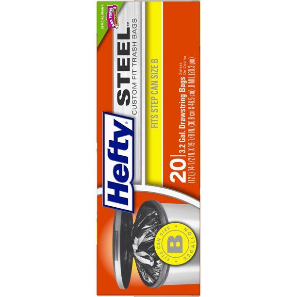 - 3.2 Gallon Garbage Bags—This package contains 20 Hefty Steel Custom Fit black, unscented, 3.2 gallon plastic trash bags