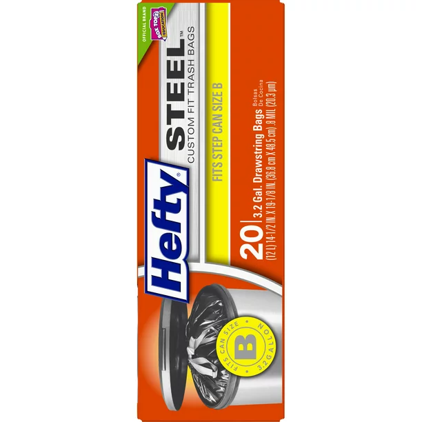 Finally, signature Hefty strength and reliability that fits perfectly in your steel step can! Hefty Steel Custom Fit Trash Bags are designed to fit a variety of steel can sizes, from size B to size L, and can also work in other cans of similar sizes throughout your home. The black color hides unsightly messes, which means these innovative trash can liners will keep your garbage in the dark. A break-resistant drawstring makes it easy to close the bag & cart it away without incident. Don’t forget; all Hefty trash bags are backed by a 100% satisfaction guarantee.