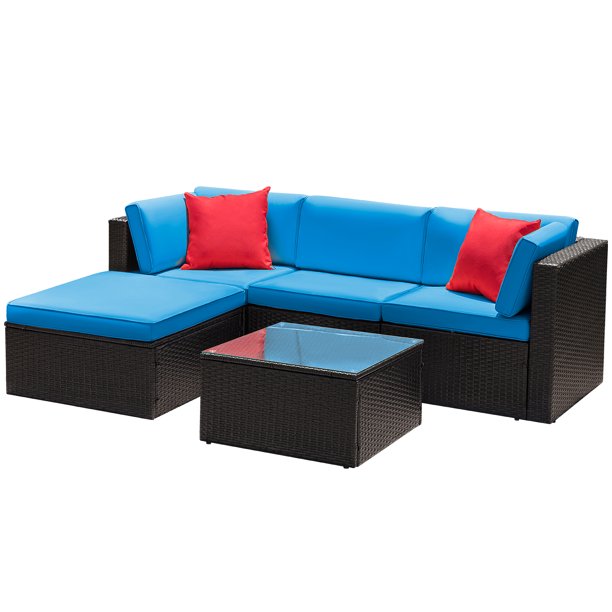 LACOO 5 Pieces Patio Sectional Set PE Rattan All-Weather Conversation Set with Table Blue 83″ L x 55″ W X 25″ H