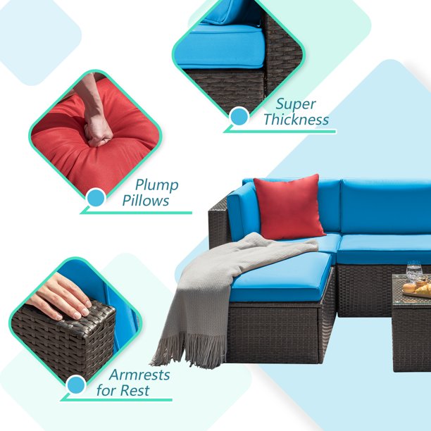 - Separable & Multifunctional: This outdoor sectional sofa set is including 2 corner chairs, 1 armless chair, 1 ottoman chair, and 1 glass coffee table which will be delivered in two cartons. This moveable design allows it to adjust a required combination and change to different shapes for seating or lying.
