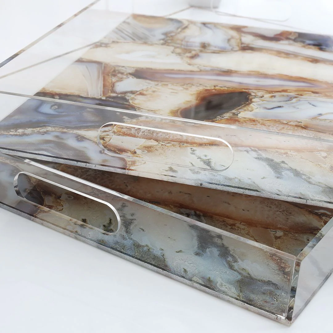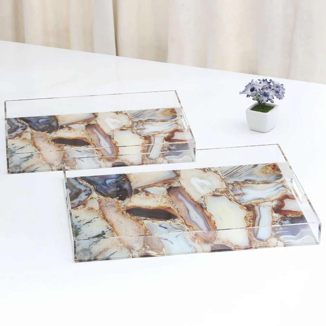 Luxor is presenting you pair of abstract art acrylic serving tray, with handles on both sides. This type of modern way of serving is quite popular in Scandinavia, Eastern Europe, and South Asia. Its texture is serene, adorable, and soothing to the eyes. Its texture is compelling and made up of spotless material. It will add beauty to your dining table and will increase the impression of your hospitality. As a result, you will be in an ecstatic position. Acrylic has more shelf life than any other material. Hence it should be a part of your luxury kitchen and dining table. You can use this tray not to serve only but also as a decorative item. It can be used as a rack for all bathing items in your bath.