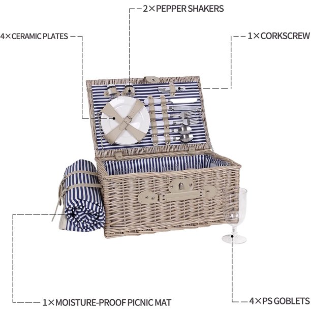 - Picnic Baskets Size & Picnic Accessories: The picnic basket size is 18″ x 12″ x 9″, contains all necessary essentials you need for your picnic: 4 x stainless steel flatware (fork, spoon and knife) with polypropylene handle, 4 x 7″ceramic plates, 4 x wine glasses, 1 x stainless steel waiter’s corkscrew with polypropylene handle, 4 x navy blue/white cotton napkins.